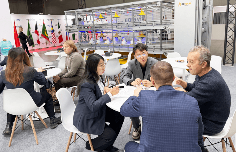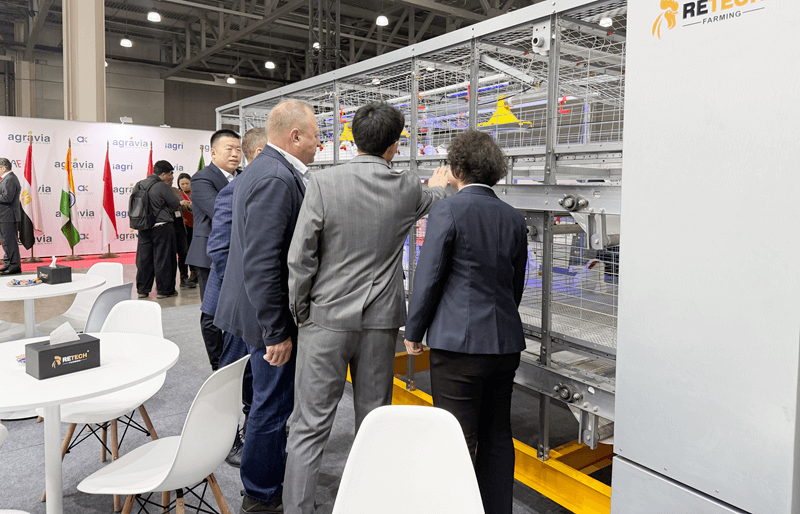 During the exhibition, the team of Retech Farming presented in detail the company’s latest automated poultry farming system, environmental control technology, and intelligent livestock management platform. The clients showed great interest in the solutions provided by Retech Farming, especially in the key issue of achieving efficient and sustainable chicken farming in cold climates. They engaged in lively discussions on this topic. The experts of Retech Farming, drawing on their rich project experience, offered practical suggestions and technical support to the farmers from Russia and surrounding areas, answering many of their questions regarding insulation, ventilation, and disease prevention.