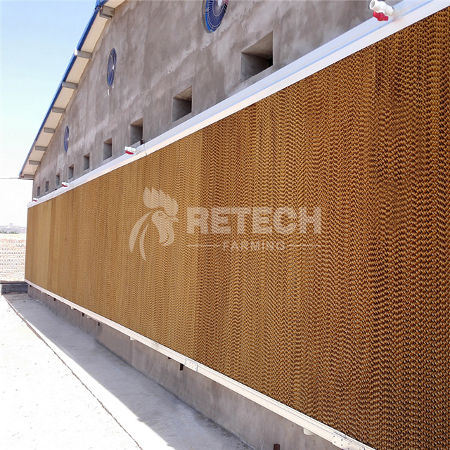 1.Cooling Pads: This is the most common evaporative cooling method. Cooling pads are usually installed at one end of the chicken house and fans are installed at the other end. The fan draws outside air into the chicken house. When the air passes through the cooling pads, the water evaporates, lowering the air temperature, and then the cool air enters the chicken house